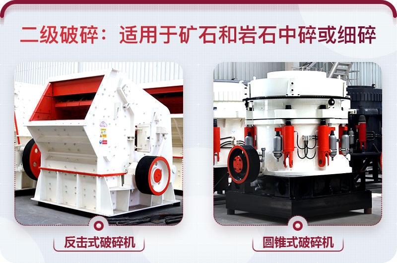 二破(圓錐破/反擊破):二破用圓錐破或反擊破都可以,只不過考慮到產量和成品粒型,前者更偏向于硬度較大的石料,后者適用于軟性物料。
